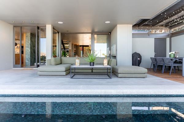 Step inside to open-plan living made for entertaining. Two spacious lounges flow into a chef-ready kitchen with seperate scullery and every modern convenience, while sliding doors open to a front patio, built-in braai, heated saltwater pool, and a sun deck. Mountain and sea views set the scene, and a separate boma with Sonos sound system ensures evenings are pure magic. The guest fourth bedroom with bathroom is situated on this level with doors opening out onto the back garden.