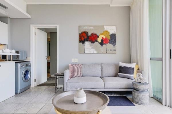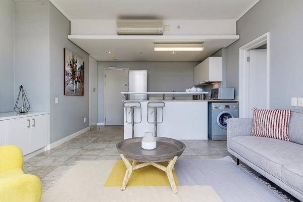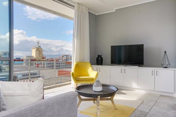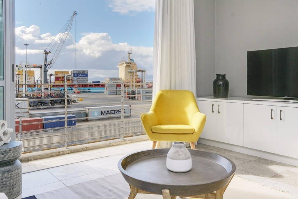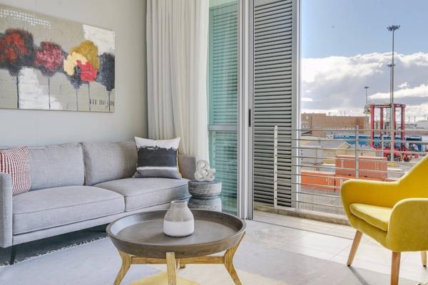 Open plan living area flows onto a sun drenched balcony that faces the harbour and see