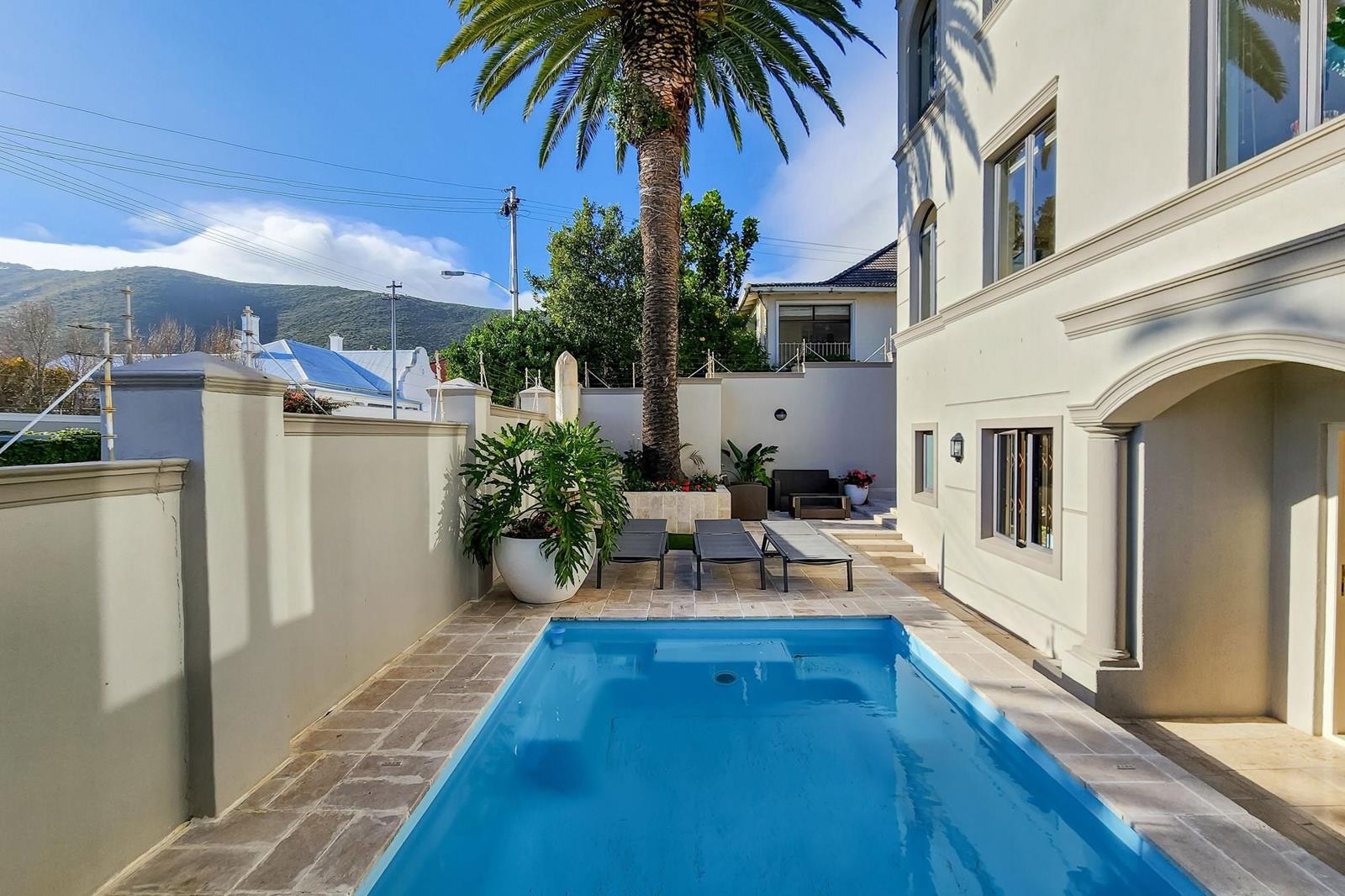 The outdoor swimming pool on the ground floor patio is very private and protected. Is has a lovely indigenous, water-wise garden and an area in the shade inviting to barbeque at any given time. P.S: The flat roof lends itself to create a rooftop gardenterrace offering breathtaking views.