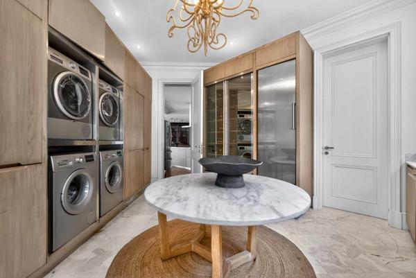 The glamorous balcony is adorned with tied-back curtains between its columns, enhancing the charm of this stunning home. An open-plan gourmet kitchen extends from the dining area, featuring a large island equipped with a six-burner gas cooker, wok, and griller. Beneath the island are two ovensone 90cm and the other 60cm. The wall hosts additional culinary amenities, including two microwaves, convection ovens, and a plate warmer. Adjacent to the kitchen is a spacious enclosed scullery with pull-out pantry cupboards and ample space for two washing machines, two tumble dryers, two dishwashers, and industrial-sized fridges.