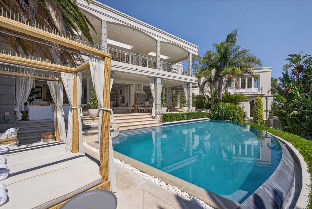 Upon entry, you are greeted by a double-volume entrance hall featuring a sweeping curved staircase with an elegant balustrade and a magnificent crystal chandelier. The main living area encompasses three open-plan rooms, with a double-sided fireplace elegantly connecting two of them. French-style concertina doors open onto a wide balcony that spans the front of the living area, complete with an additional fireplace for warmth and ambiance on cooler evenings. From the balcony, steps lead down to an inviting pool area, accompanied by a gazebo with sunbeds and a jacuzzi. Beyond the pool lies a tropical garden, with a covered gazebo situated at the property''s edge.