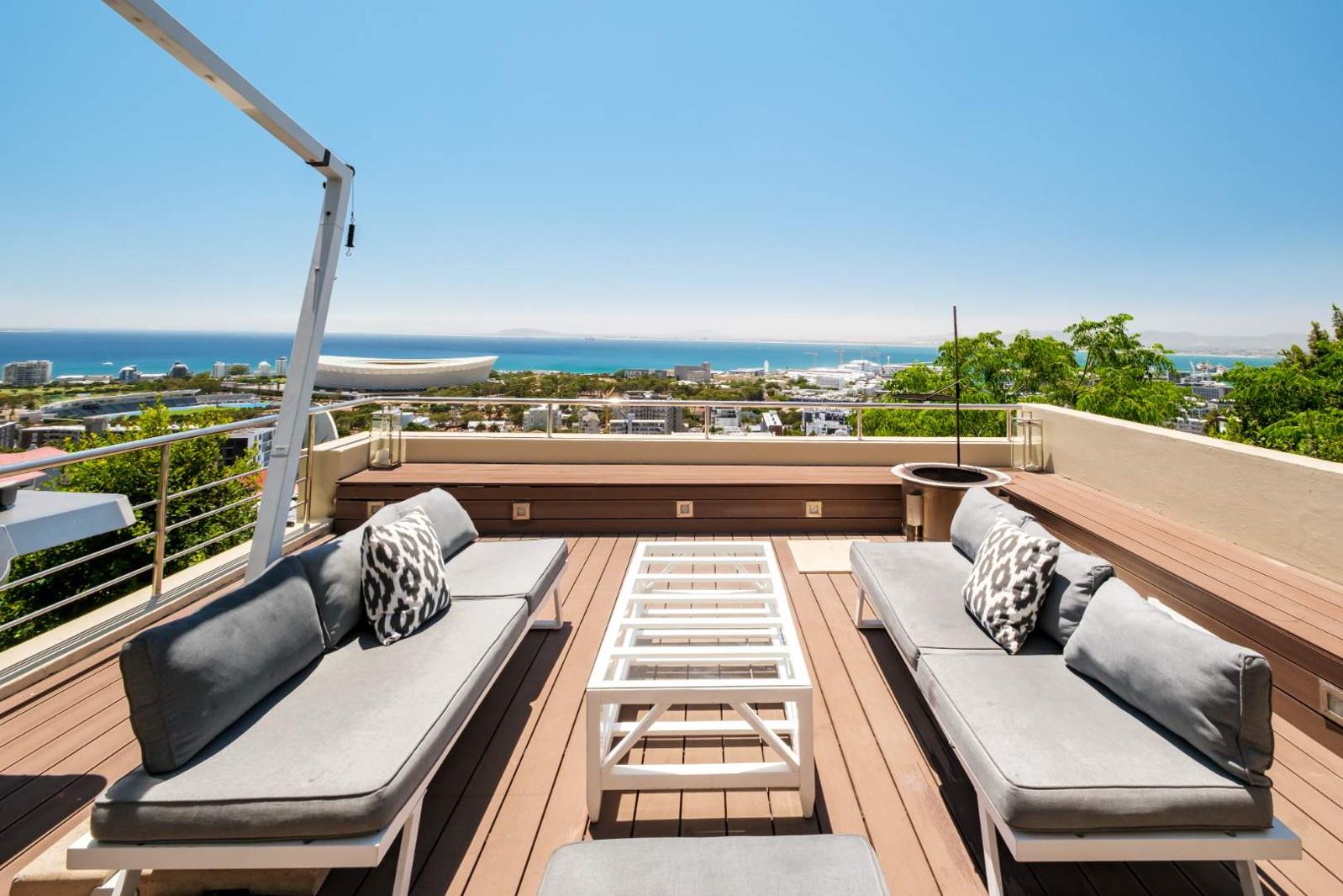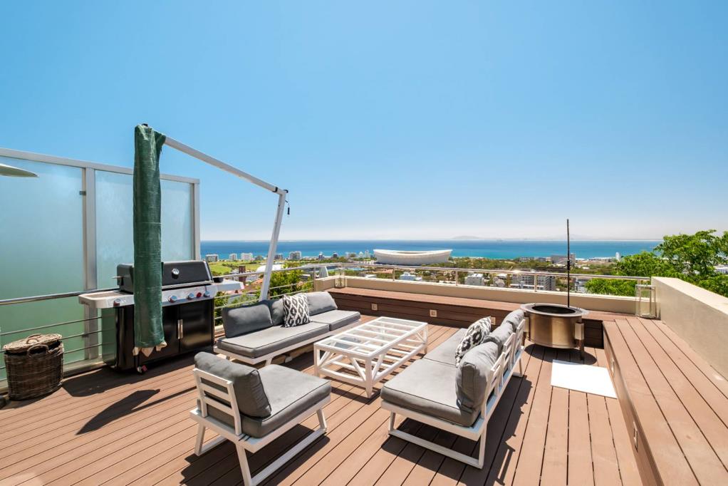 Located on Merriman Road, the highest road in Upper Green Point, this apartment has uninterrupted views over the V&A Waterfront, Green Point Stadium, and the rest of the City. Merriman Road in an exclusive road that ends in a cul-de-sac providing a sense of peace and privacy to residents. You can also hike straight onto Signal Hill and into Table Mountain National park from your doorstep. Properties in this location seldom come ontothemarket.