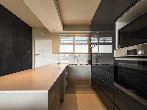 High-end finishes throughout. Two generous bedrooms with built-in cupboards. Two modern bathrooms main en-suite. Open-plan designer kitchen and living area filled with natural light.