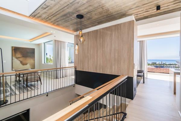 Open-plan lounge with skylights and sweeping sea views