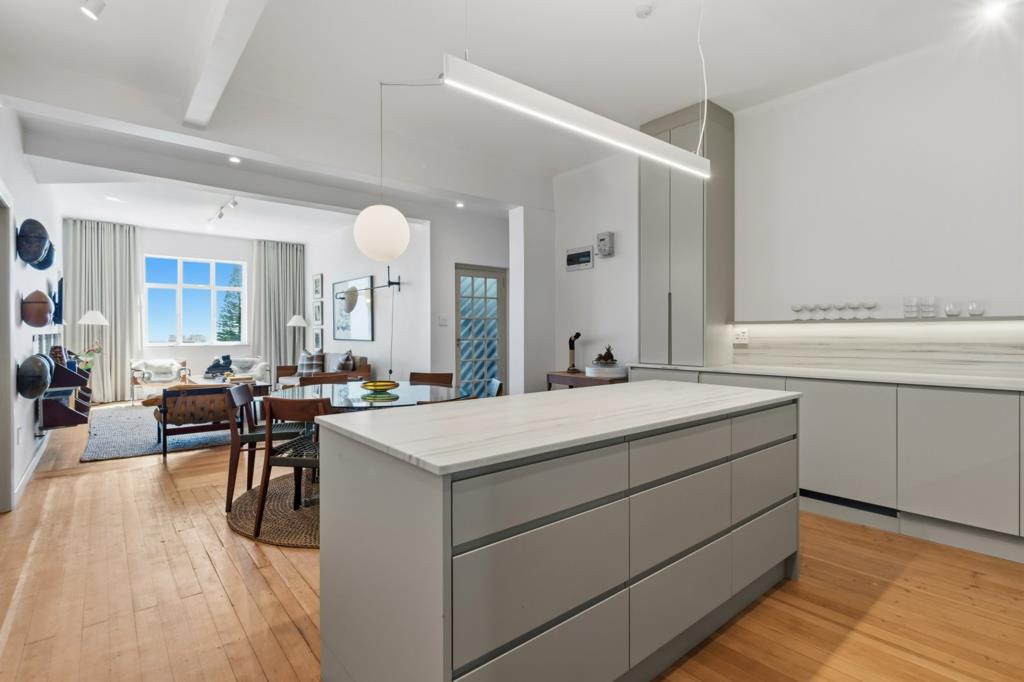 The apartment has undergone a comprehensive renovation, featuring an elegant new kitchen with integrated Smeg appliances electric oven, gas hob and dishwasher, natural stone finishes and beautifully crafted cabinetry laundry washing machine and dryer space in cupboards. Bespoke joinery continues through the bedrooms and bathrooms, providing generous and stylish storage.