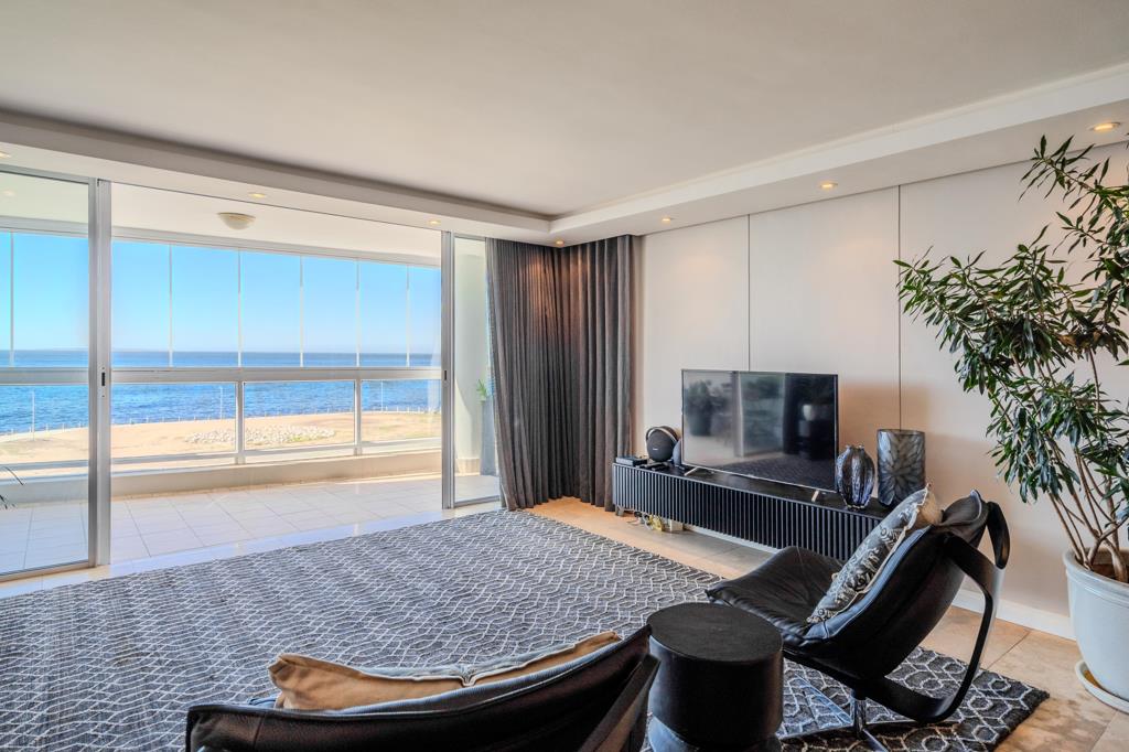 Situated in the highly sought-after area of Mouille Point, this expansive 200 square meter apartment offers a rare blend of space, light and world-class views. The residence opens into a grand open-plan living, dining and kitchen area designed for seamless entertaining. The kitchen is sophisticated and practical, featuring a separate scullery to keep the main culinary space pristine. A defining feature of this living space is the floor to ceiling glass shutters on the balcony when opened or closed, they invite an abundance of natural light to flood the entire apartment, creating a bright and airy atmosphere throughout the day while offering a 180 degree ocean view right on your doorstep, perfectly framed by unforgettable Atlantic sunsets that transform the sky each evening.