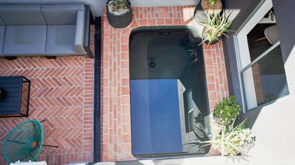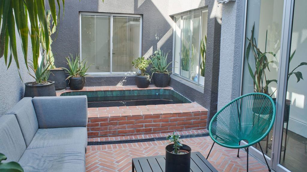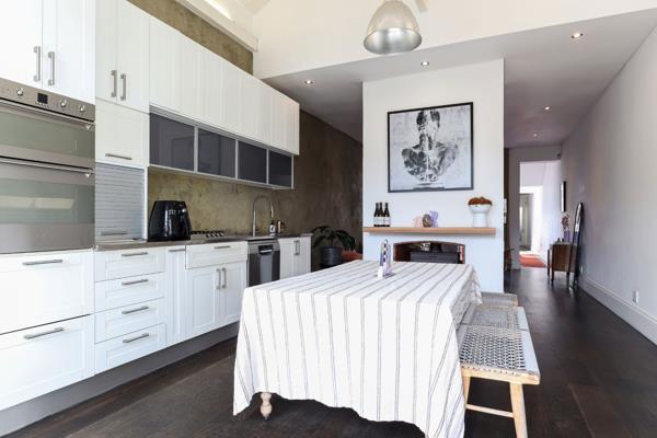 A lovely entrance patio with built in braai offers a sunny outdoor entertainment area. Enter into the heart of the home, the living space has been renovated with superb design and generous dimensions. A double-sided wood burning fireplace separates the large eat in kitchen and the grand lounge with high ceilings and tall glass doors allowing plenty of natural light in. This leads to a tranquil and peaceful private courtyard with inviting plunge pool. There is an additional study or third bedroom on the ground floor and guest toilet with shower. Spiral stairs lead to a further two bedrooms upstairs both ensuite and overlooking the central courtyard. The main bedroom has full ensuite bathroom and plenty of closet space. Off street parking under covered carport.