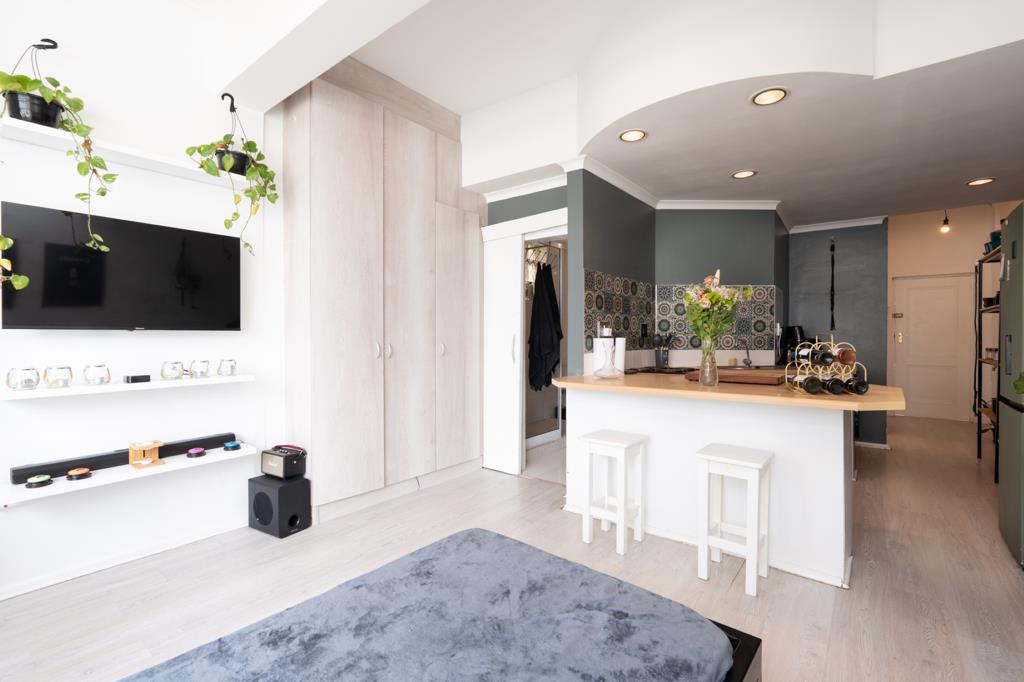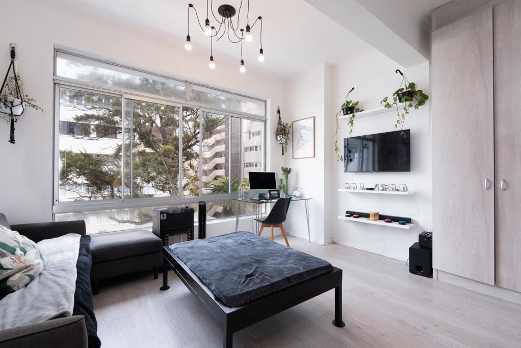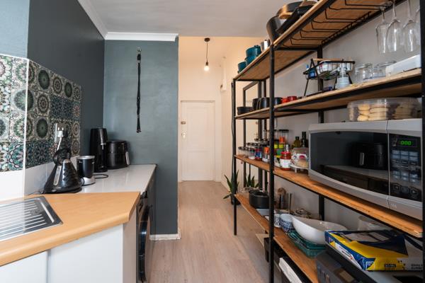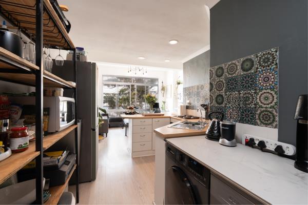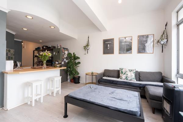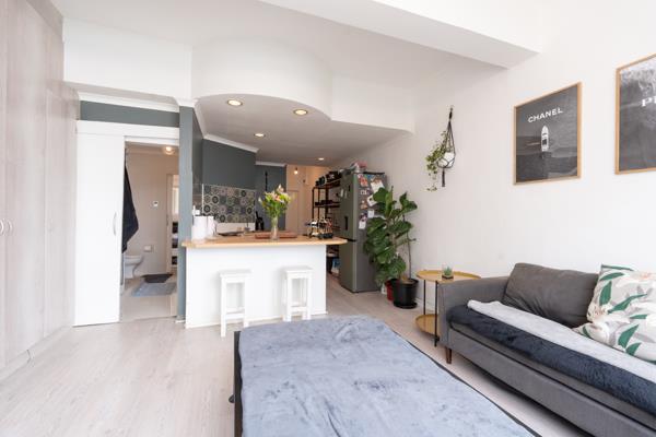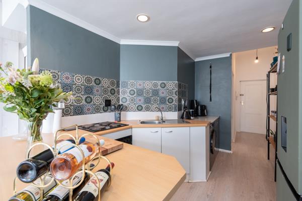 Open plan kitchen with space for a dishwasher and washing machine leading to the lounge area with large windows offering gorgeous Lions Head and Table Mountain views. Bathroom with shower. Bedroom with plenty built-in cupboards.