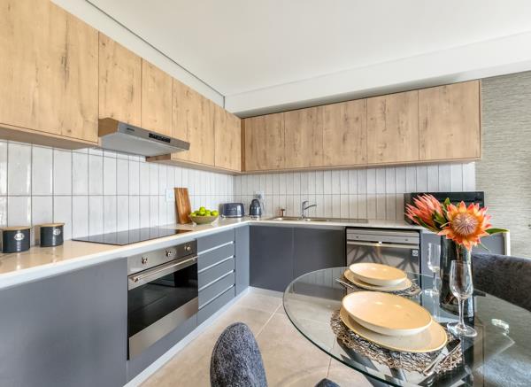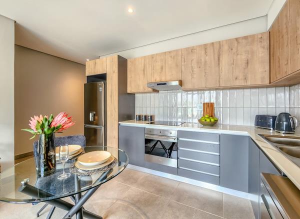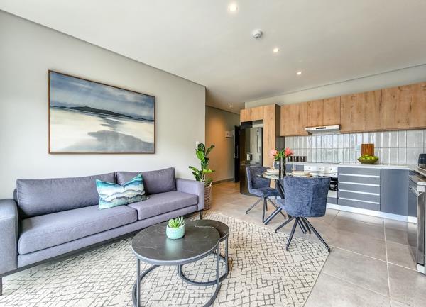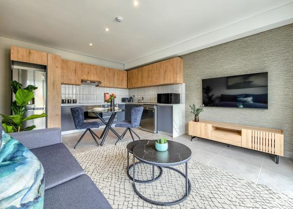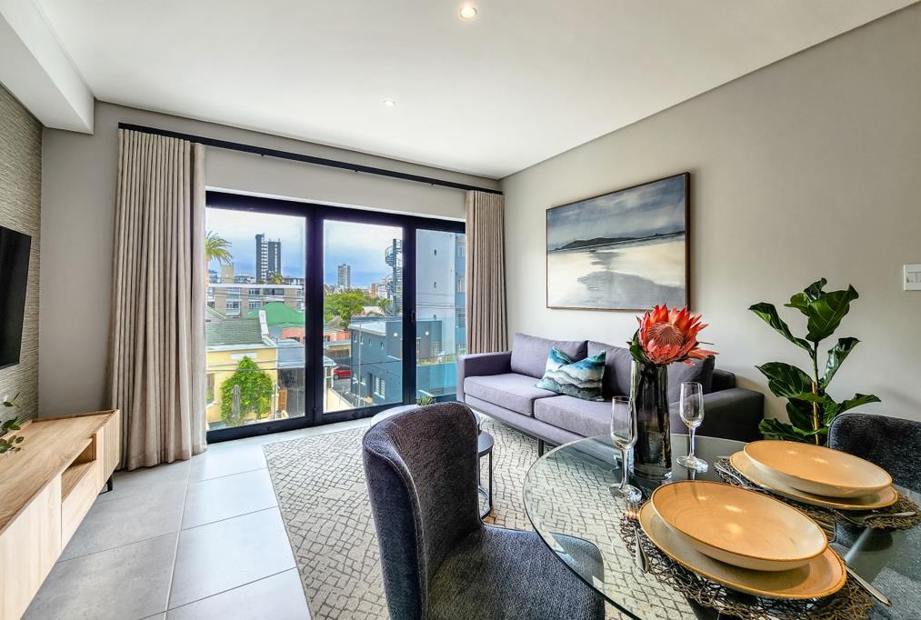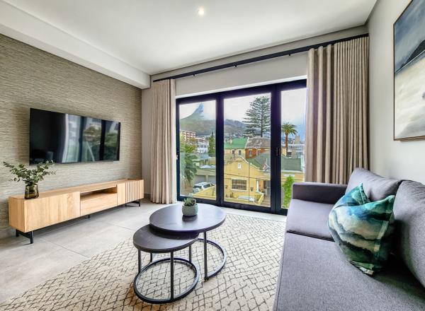 The open-plan layout features a modern kitchen with high-end fittings that flows seamlessly into an inviting living area with a Juliet balcony with views towards the iconic Lions Head and Table Mountain beyond.