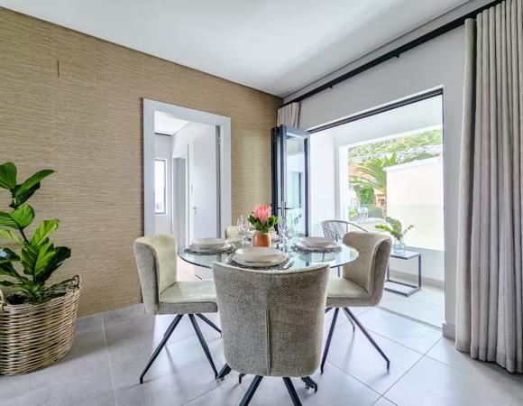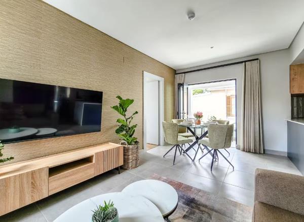 The open-plan layout features a modern kitchen with high-end fittings that flows seamlessly into an inviting living and dining area with a covered patio with views towards the iconic Lions Head.