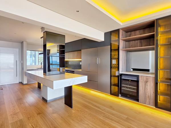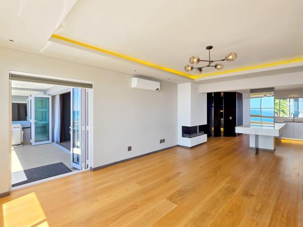 The apartment features a modern open-plan layout finished to the highest standard, including solid oak oggie flooring, a striking porcelain and metallic kitchen, and Siemens integrated appliances with Blum hardware throughout. Thoughtfully curated LED mood lighting enhances the refined interior, while a bio-fuel fireplace adds warmth and atmosphere.