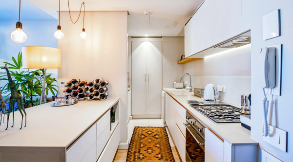 Open-plan kitchen with sleek modern finishes and a built-in gas hob