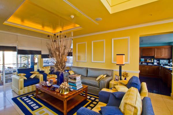 Spacious double-volume living & dining area with marble floors, built-in fireplace, bespoke recessed ceilings, and custom wainscoting.