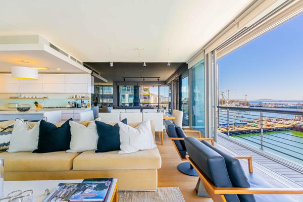 Spacious open-plan living and dining areas flow seamlessly onto a corner-position balcony boasting spectacular views of the harbour, Table Mountain, and the trendy Silo District.