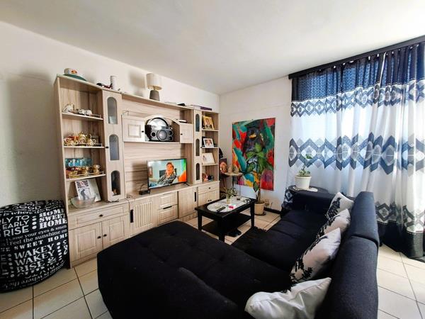 The bedroom is a spacious haven, offering a tranquil retreat with tiled floors and built-in cupboards.