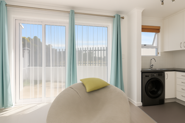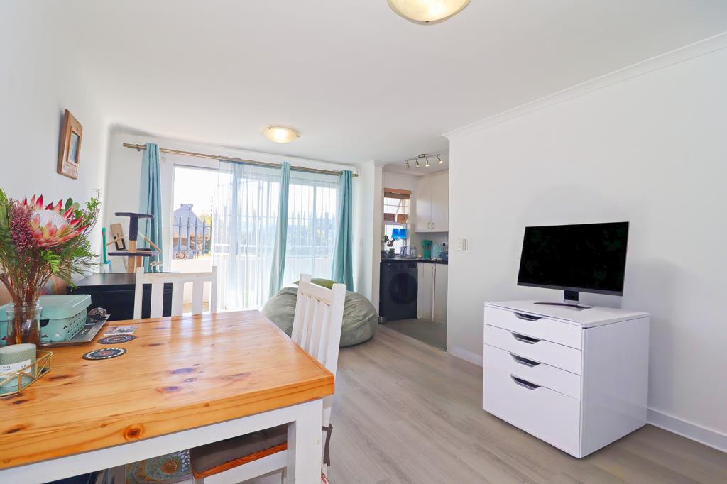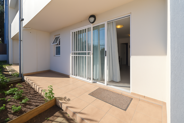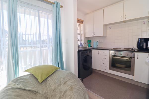 Inside, the open-plan layout includes a compact kitchen with granite countertops and a single water point, flowing seamlessly into the sunny lounge. A sliding door with a Trellidor security gate connects the living area to the inviting outdoor space.