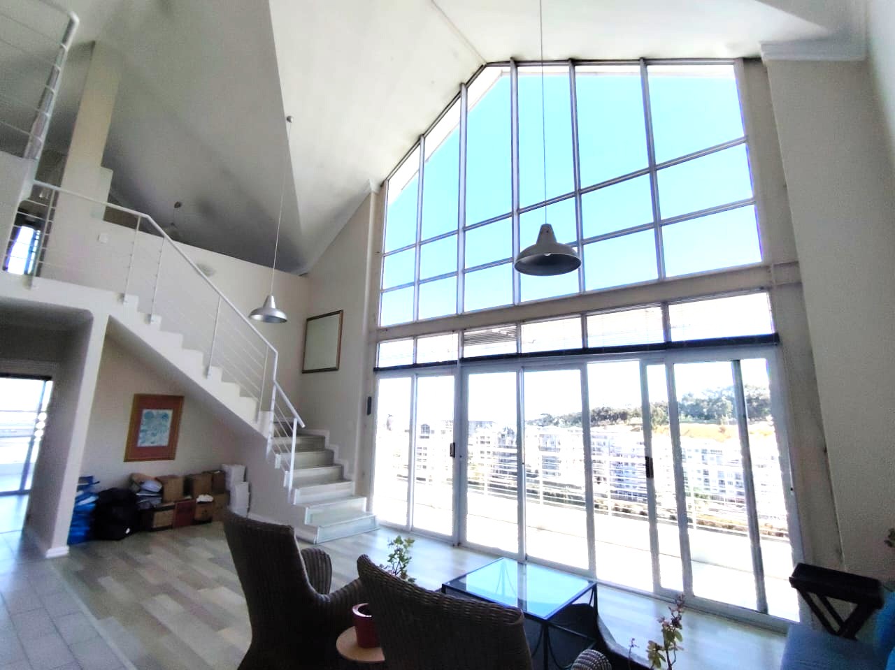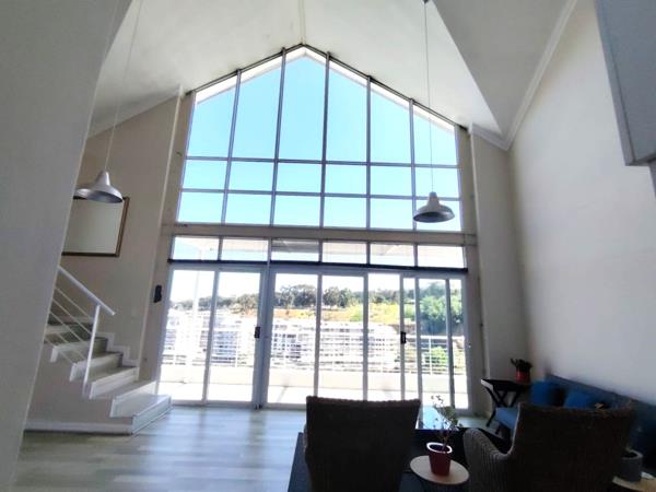 This double-volume residence features an open-plan design that seamlessly connects the modern kitchen, dining, and lounge areas. Expansive floor-to-ceiling glass windows and sliding doors flood the space with natural light and open onto a generous balcony, offering breathtaking panoramic views over Tyger Lake.