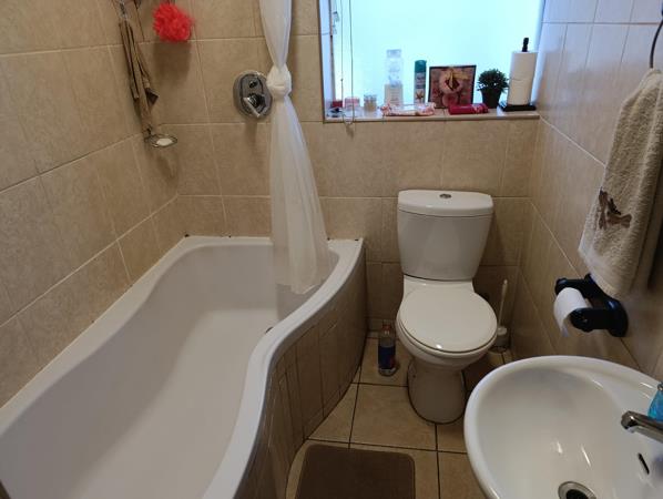 Family Bathroom: Tidy bathroom with a bath, shower-over-bath, toilet, and basin.
