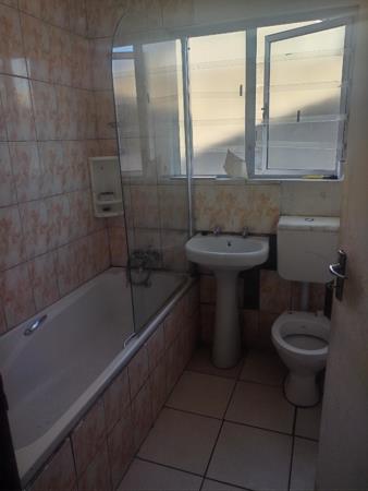 Accommodation comprises two well-proportioned bedrooms, each featuring the same practical tiled flooring and windows equipped with burglar bars for added security. A single bathroom serves the household, maintaining the consistent and easy-to-clean tiled finish.