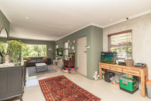 The main house features an incredible, super-modern open-plan living and entertaining space, incorporating a stylish lounge, contemporary kitchen, dining area, and an inviting indoor braai room. A closed-combustion fireplace provides cosy warmth during winter, while aluminium stacking doors open seamlessly onto a wooden deck. From here, you can enjoy sublime views of the distant vineyards as well as the homes beautifully manicured garden.