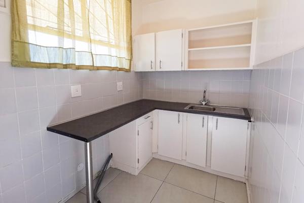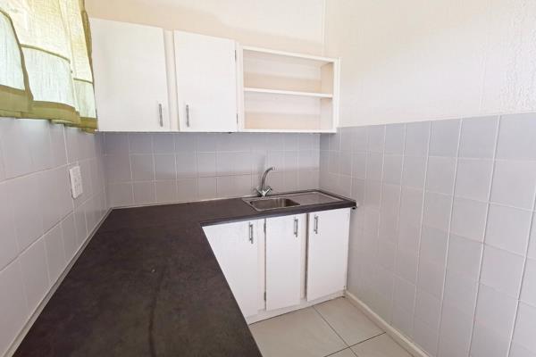 The sun-drenched living area overlooks the lush, well-kept gardens and sparkling communal pool, creating a peaceful and inviting atmosphere. The bedroom is generously sized, easily accommodating a double bed, and comes with built-in cupboards. The separate kitchen is neat and functional, offering space for a fridge and a water point, while the bathroom offers a shower over bath.