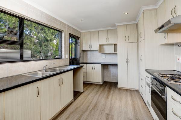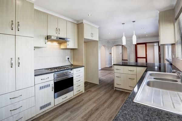 The kitchen is modern with granite finishes and a gas hob and oven. It offers space for various appliances. The spacious window with a blind allows for plenty of natural light. There are four spacious bedrooms with vinyl flooring, blinds and cupboards. The main bedroom is fitted with plenty of cupboards, an outside door leading to the garden and an air conditioner.