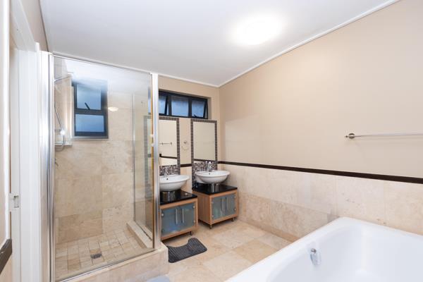 The main bedroom is situated upstairs and has an en-suite bathroom with double sinks, a bath and shower. The toilet is separate.