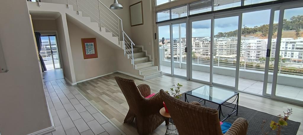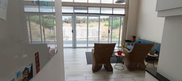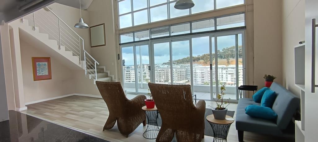 Step out onto the private balcony, an extension of the living space, perfect for enjoying the vibrant urban landscape and distant views. The property includes two secure garages and an additional parking bay, ensuring ample space for vehicles. Residents benefit from 24-hour security, offering peace of mind within this complex setting. Tyger Valley is a dynamic area known for its convenience and accessibility, offering a blend of residential comfort and urban amenities, including its unique lakefront feature. Loft upstairs with bedroom and living space and sliding door that opens up to panoramic views.