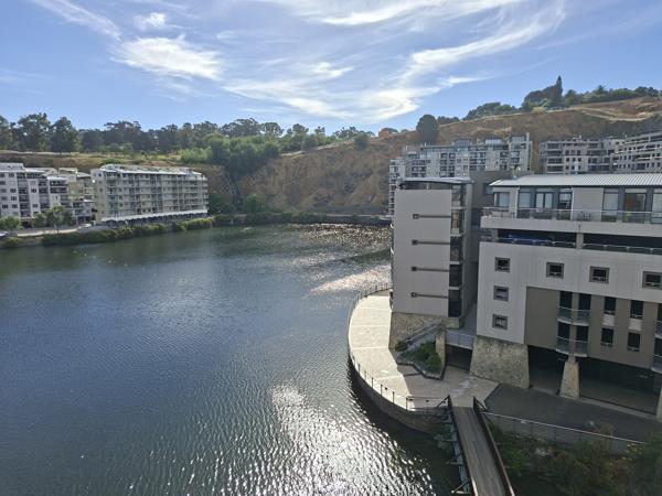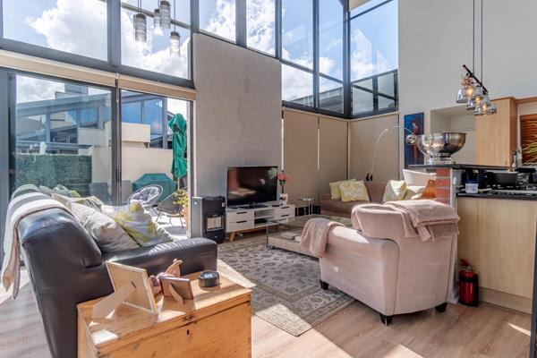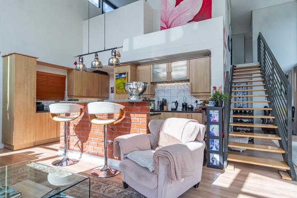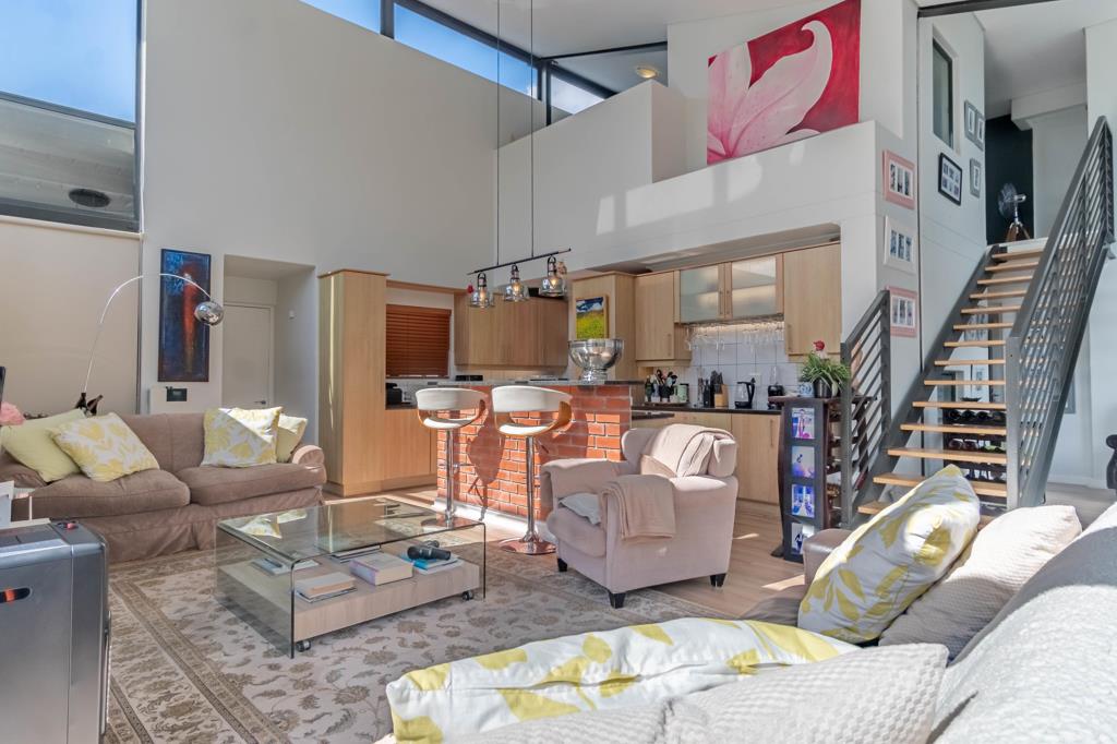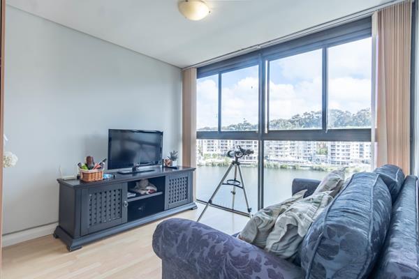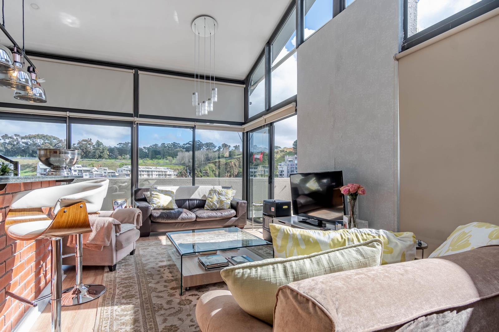 Bright, sunlit living in a double-volume penthouse overlooking the serene Tyger Waterfront lake. The double-volume ceiling creates a sense of space and airiness.