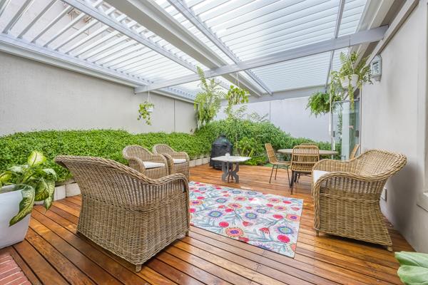 The outdoor space is equally impressive, with a wooden deck and a custom-built louvre awning, allowing year-round enjoyment of this tranquil garden oasis. The landscaped front garden enhances the homes remarkable curb appeal.