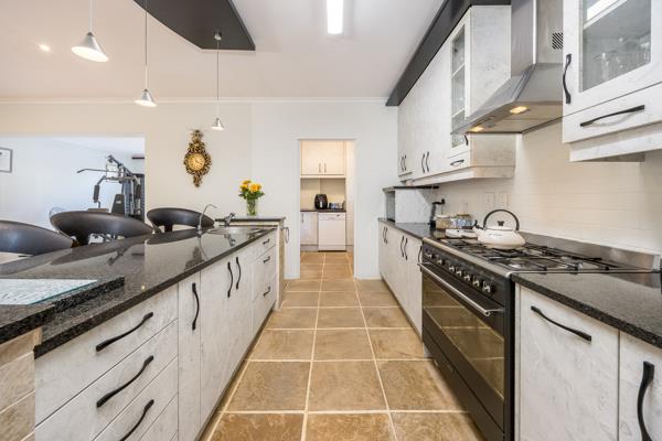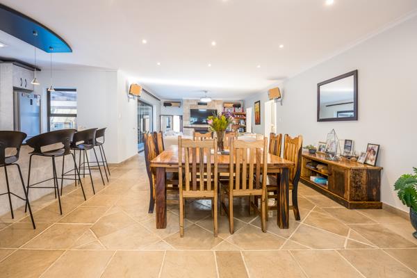 This beautiful property is inviting, featuring water features at the entrance. Ample off-street parking for guests as well. This home is built for the entertainer! From the large, open-plan kitchen with ample cupboard space to the built-in braai with extra-strong braai spit capability, gas braai, and prep basin. The living areas have an unhampered line of sight from one end to the other and open out to the pool through seamless glass doors, making it an easy transition between the indoor and outdoor spaces. The sparkling pool has a chlorinator and is heated with a heat pump. Enjoy family time lounging around on the built-in seating area. It also boasts a cellar and Bar area with its own braai and easy flow to the outdoor patio. This property offers 4 spacious bedrooms, of which the guest bedroom and main bedroom have their own en suites. The main bedroom is a luxurious suite with a private lounge, coffee station and study. Load shedding is not a concern in this property as it has an Inverter and backup batteries.