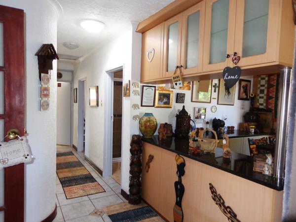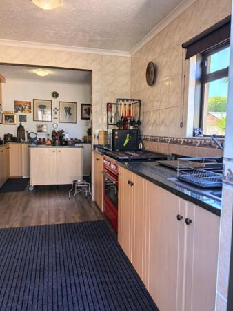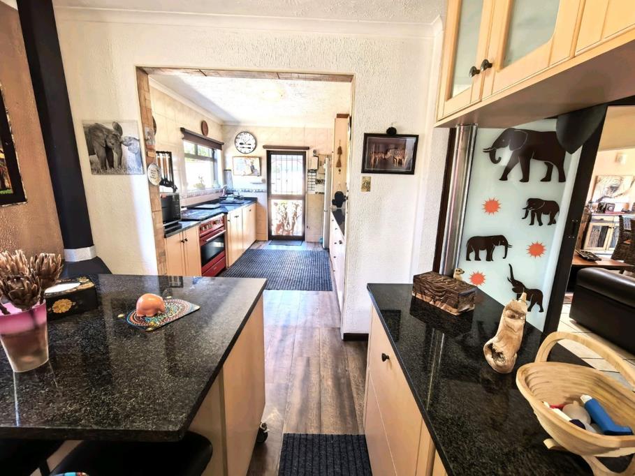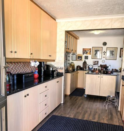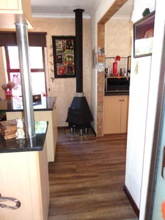 Expansive modern, granite and wood kitchen with generous cupboard space, centre island and cosy fireplace. Lovely Open plan Lounge and Dining room also offers a wood burning fireplace.