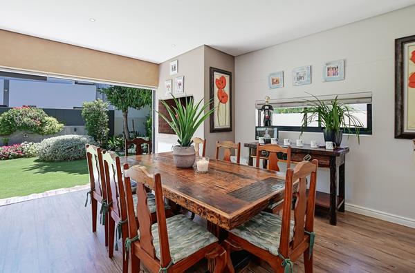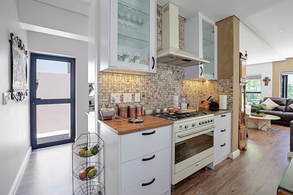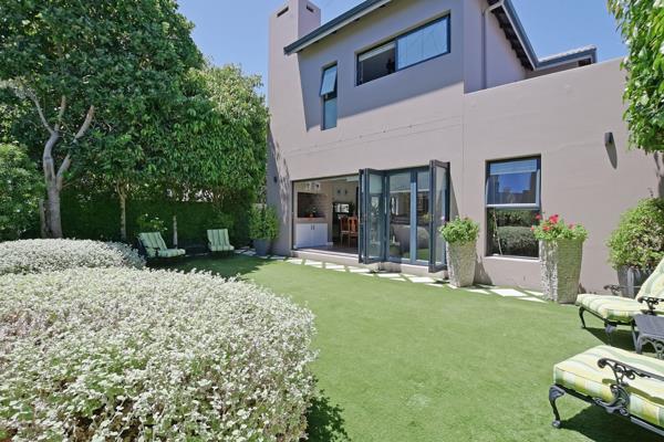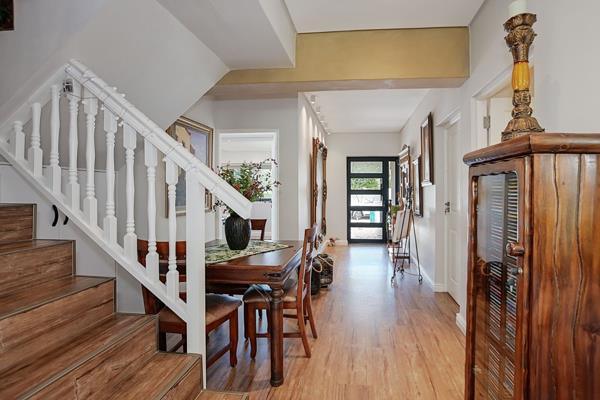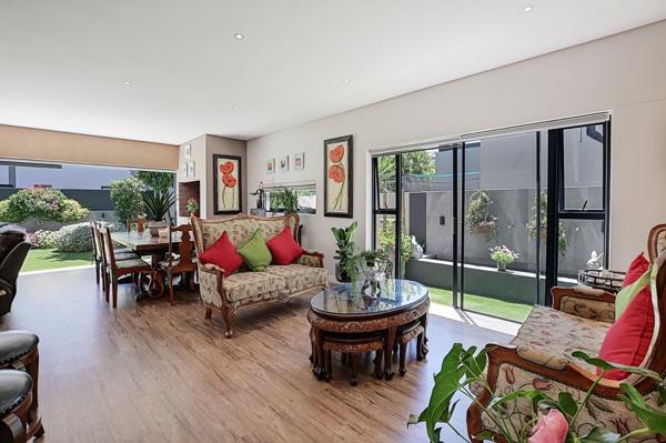 Designed for seamless indoor-outdoor living, the open-plan living areas flow effortlessly through stack-away doors to a sunny, private, and secure garden oasis, complete with tranquil water features ideal for both entertaining and unwinding. The living areas includes a lounge, dining room and indoor braai room. The stylish open-plan kitchen is fitted with a Smeg stove featuring a gas hob and electric oven, complemented by a separate scullery leading to a dedicated utility area, with storage. The entrance hall with staircase, has direct acess to the garage and space enough for another seating area.