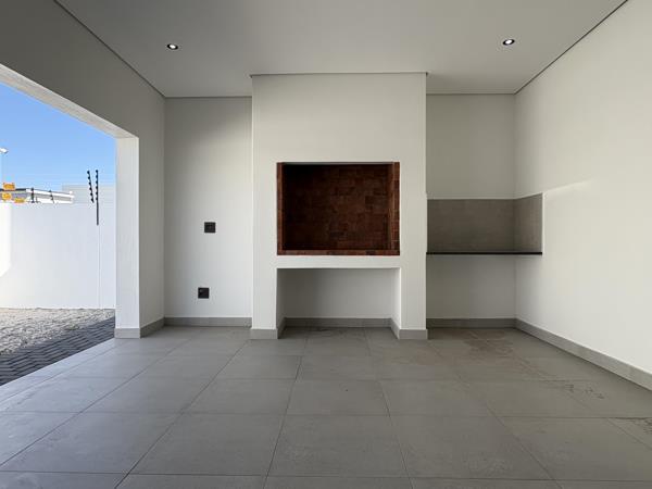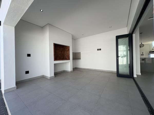 Downstairs welcomes you with expansive open-plan living areas designed for both comfort and entertaining. The seamless flow from the sleek, contemporary kitchen to the dining and lounge areas creates a light-filled, airy space. Stacker doors open out to a covered entertainment patio complete with a built-in braai perfect for hosting guests all year round.