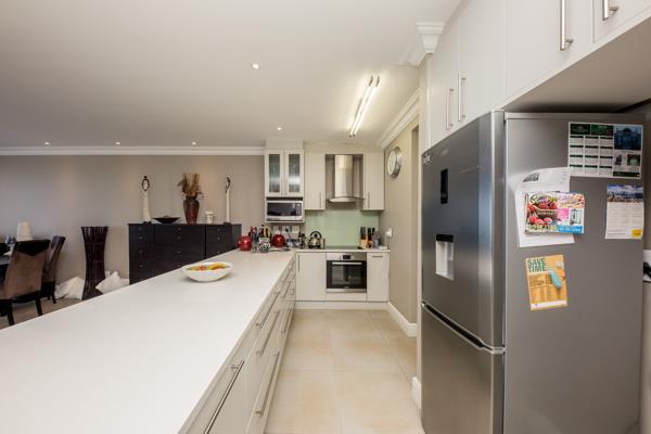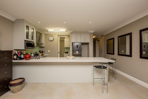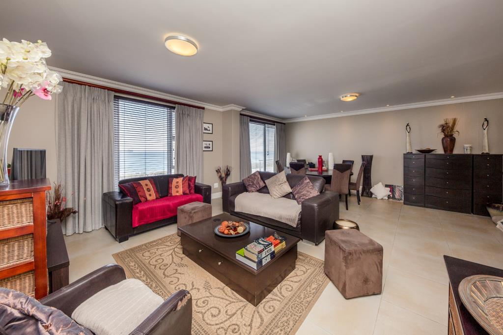 Modern and luxurious apartment in boutique sized complex offering exellent security, communal swimming pool and wonderful Table Mountain to Atlantic Ocean vistas with only four other neighbours making it the ideal lock up and go or executive holiday suite Lift foyer leads into spacious front entrance hall into the apartment whilst offering generous open plan living areas tiled throughout The entrance hall offers loads of extra cupboards for ample storage Fully enclosed balcony with built in BBQ with sliding windows and blinds to control both sun and wind making it a space utilized all year round Caesar stone kitchen with separate utilitylaundry Three en-suite bedrooms are carpeted with built in cupboards with their own balcony All en-suites are complete with full shower and baths Guest toilet Double Auto garage measuring out 39sqm under building.