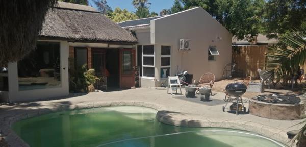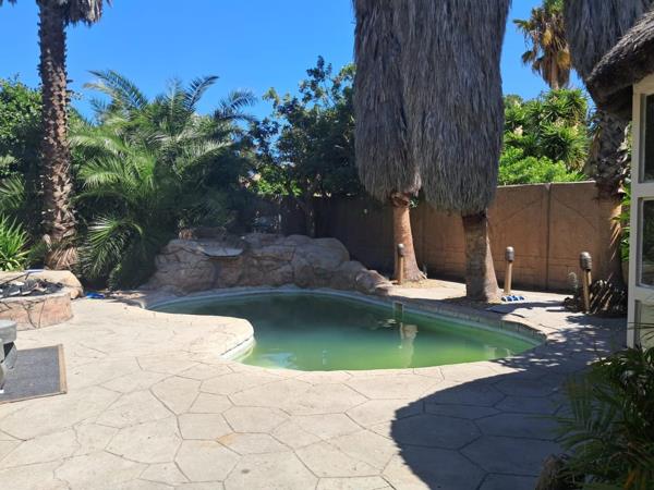 Thatched roof entertainment area, bar, braai, jacuzzi overlooking the swimming pool.