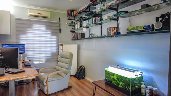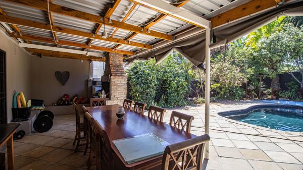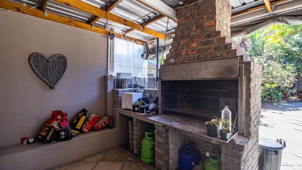 The home offers an open-plan lounge and dining area that flows seamlessly onto a covered patio with a built-in braai, perfect for entertaining. A separate study nook provides an ideal work-from-home space.