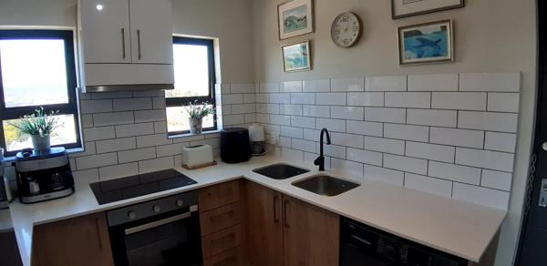 The well-appointed kitchen features ample built-in cupboards, a sleek induction stove, oven and an extractor fan, along with dedicated space for both a washing machine and fridge. It flows effortlessly into a spacious open-plan dining and lounge area, which opens onto a generous balcony ideal for relaxing or entertaining while enjoying elevated views.