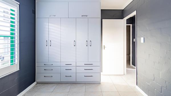 Both bedrooms are equipped with built-in cupboards, providing ample storage space and maintaining the sleek, uncluttered aesthetic of the apartment. The modern bathroom is tastefully designed.