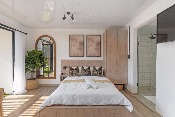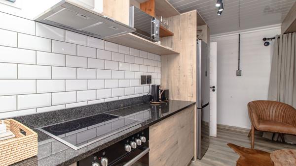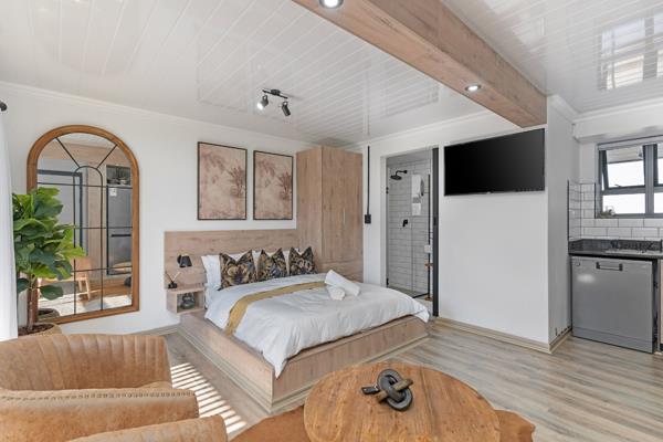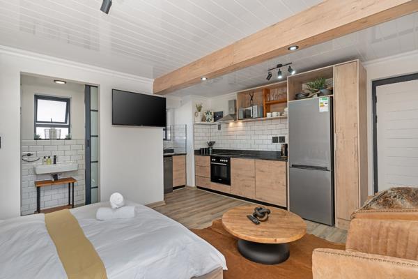 The well-appointed kitchen is a highlight, featuring modern appliances, wooden-look cabinets, and a subway tile backsplash, ensuring both aesthetic appeal and practicality. It integrates effortlessly into the main living space, which includes a comfortable sleeping area and a dedicated lounge zone, complete with a wall-mounted TV for entertainment. Natural light floods the space, enhancing the bright and inviting atmosphere.