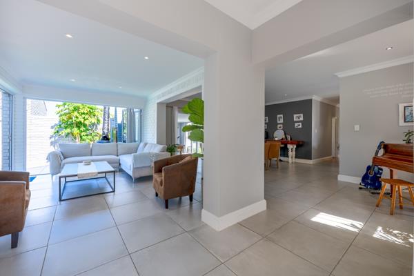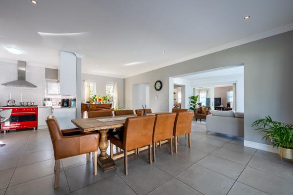The expansive open-plan living and dining areas flow effortlessly into a contemporary kitchen with a separate scullery, ideal for both everyday living and entertaining on a grand scale.
