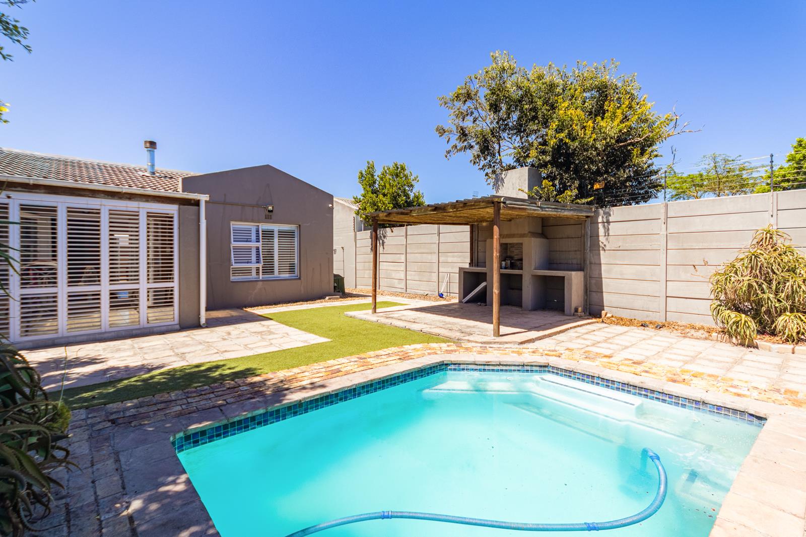 Designed with easy living in mind, the home flows seamlessly from its interior spaces to an outdoor entertainment area where lifestyle takes centre stage. A sparkling swimming pool and dedicated braai area create the ideal setting for hosting friends and family, enjoying warm summer evenings, or simply unwinding in your own private oasis. The low-maintenance garden adds to the appeal, offering greenery without the upkeep.