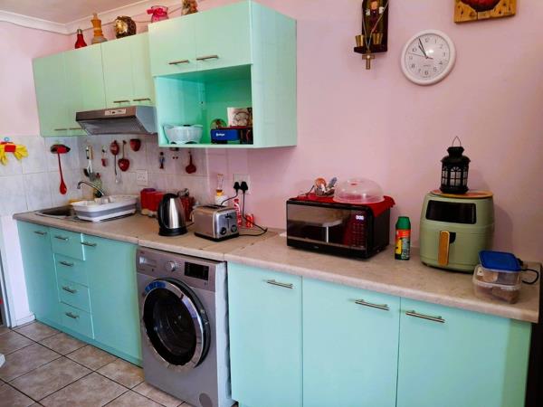 The kitchen is fitted with built-in cupboards, offering ample storage, and includes a connection point for either a dishwasher or washing machine, making it both functional and convenient.