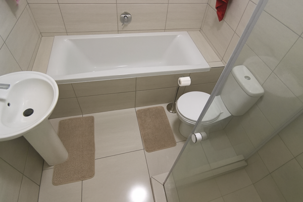 The residence offers two comfortable bedrooms, each with a modern aesthetic, complemented by a well-appointed bathroom with a bathtub and shower.