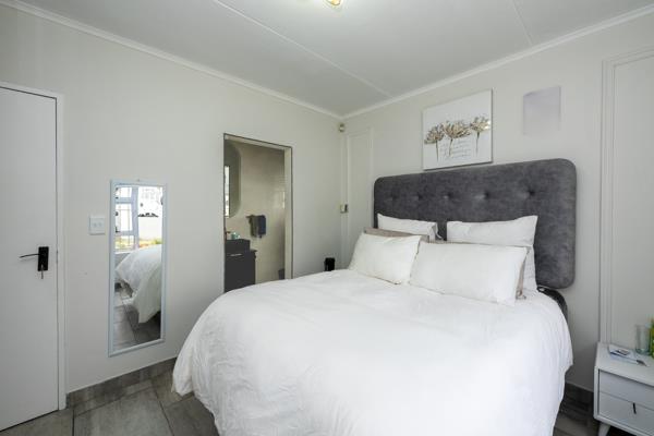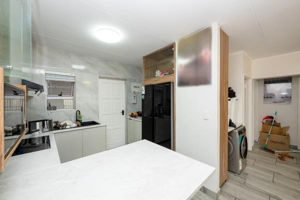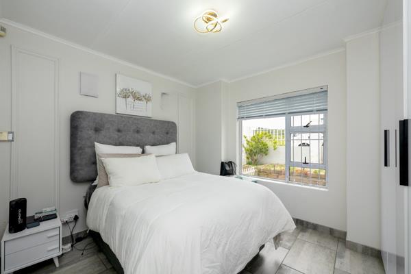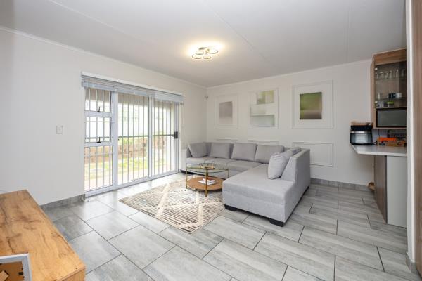 As you enter the home, you are welcomed by a spacious open-plan lounge complete with beautifully tiled flooring. The lounge extends through sliding doors onto a patio and the communal garden, creating the perfect space for relaxing and entertaining. The modern kitchen is equipped with newly fitted built-in cupboards, ample countertop space, an under-counter oven and hob, and a dedicated space for a fridge. Just off the kitchen, you will find the dedicated laundry nook with one plumbing point.