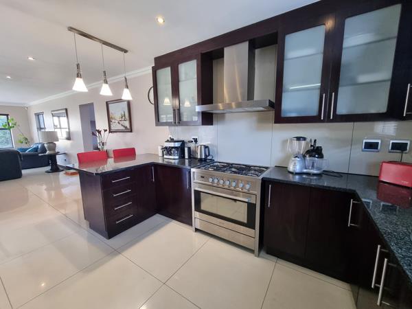 The stylish kitchen features a gas hob and separate scullery, flowing into generous dining and lounge spaces. Two braai rooms add to the homes appeal for year-round gatherings.