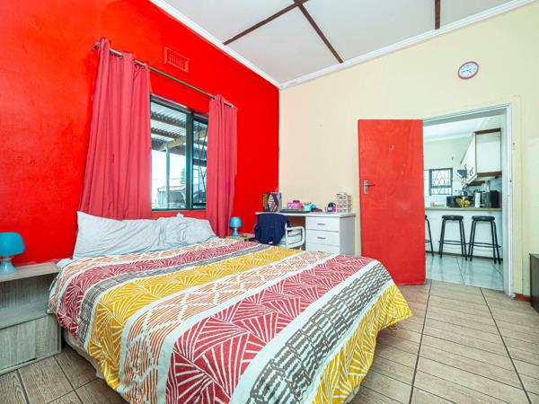 The lounge is spacious with high ceilings and tiled floors. There is a family bathroom and a guest toilet. The main bedroom is generously sized, featuring built-in cupboards, laminated flooring, high ceilings, and an en-suite bathroom.