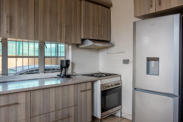 Upon arrival, you are welcomed into an open-plan lounge and dining area. The kitchen offers built-in cupboards, providing convenient storage space.
