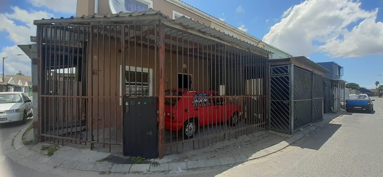 A corner property in the suburban area of Hanover Park, Cape Town, presents a practical and secure residential opportunity. The exterior features a functional covered carport, providing secure parking for two vehicles within an enclosed metal cage structure, ensuring direct street access and convenience. This multi-story residence offers a solid foundation for those looking to invest and personalise their living space.