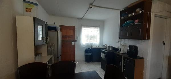 Inside, the home features durable tiled flooring throughout the main living areas. The ground floor encompasses a combined lounge and dining space, offering an open and functional environment. The kitchen, while presenting a dated aesthetic, is equipped with essential appliances, ample cabinet storage, and benefits from natural light, providing a functional space for meal preparation. A staircase provides access to the upper level, indicating a multi-story design.